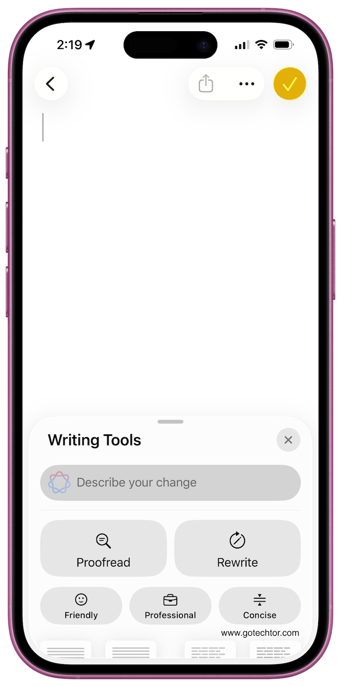Already have text written? Select it and tap Writing Tools to proofread, rewrite, or shift the tone entirely.